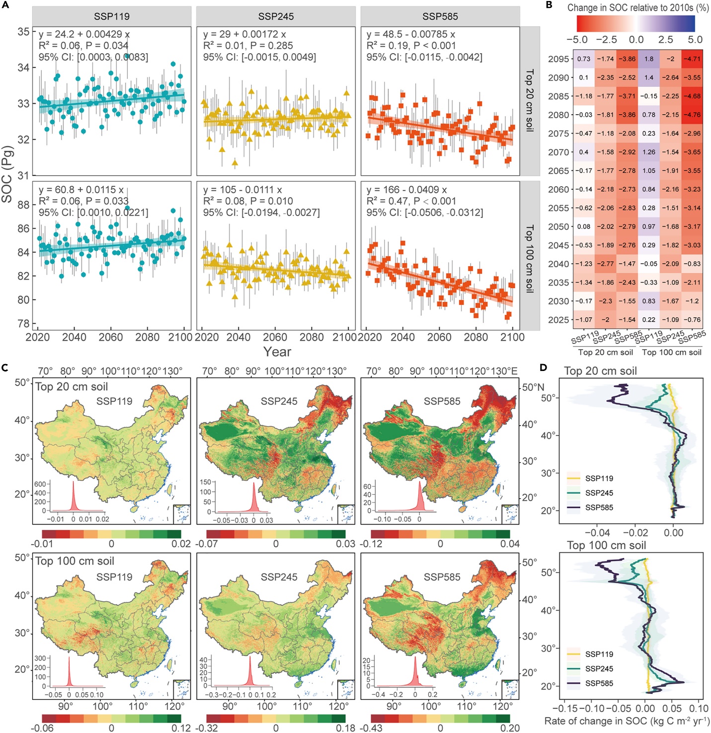在全球应对气候变化的紧迫背景下,中国承诺在2060年前实现碳中和。为了实现这一目标,土壤有机碳的有效管理显得尤为重要。作为陆地生态系统中最大的碳库,土壤在气候变化缓解战略中具有关键作用。然而,不同共享社会经济路径(SSPs)对中国土壤碳库的影响尚未完全揭示。本研究就中国土壤有机碳储量的未来前景进行了深入探索。研究团队编制了中国陆地生态系统土壤有机碳数据库,利用多元数字土壤制图方法估算了当前的土壤有机碳储量,并通过自主开发的气候数据驱动模型(国家尺度预测精度达到73%),预测了2021年至2100年间不同SSP情景下的土壤有机碳储量变化。